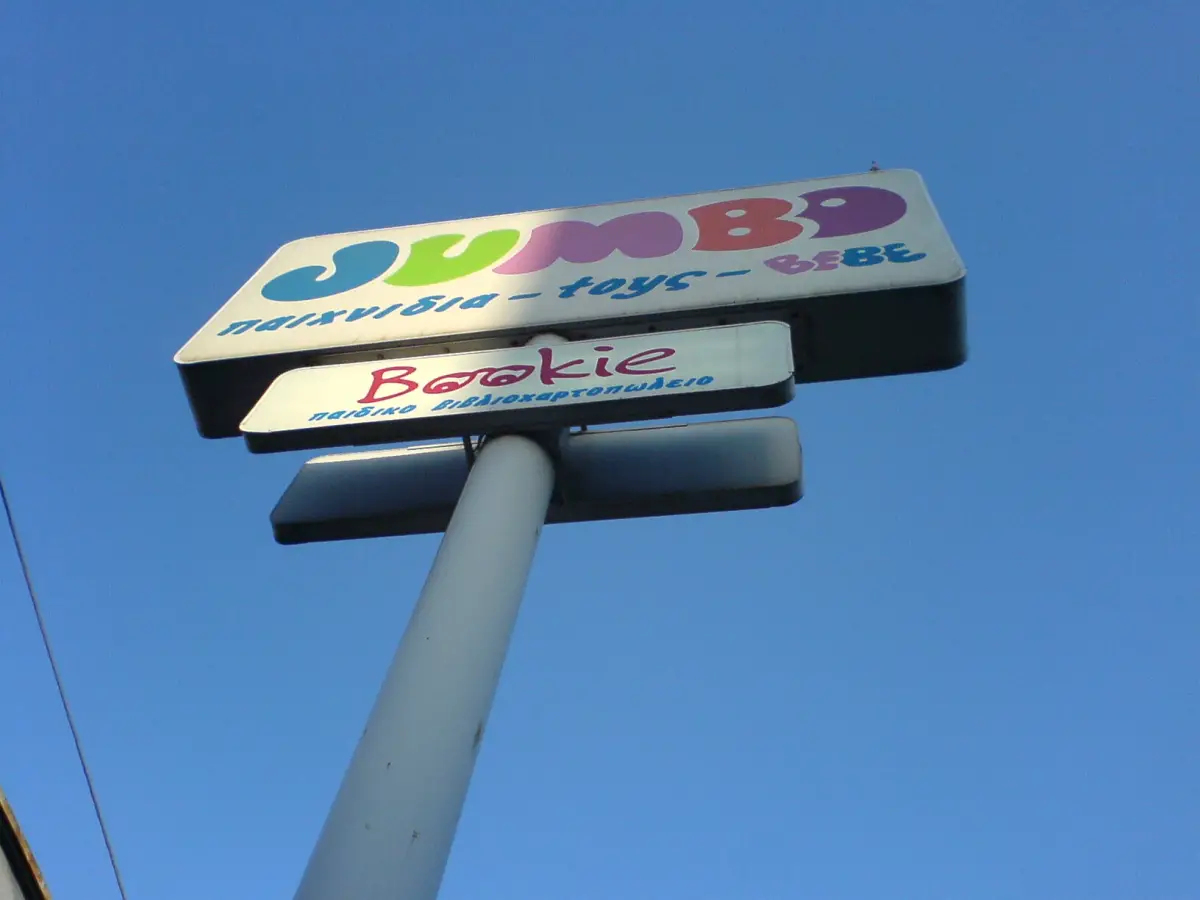 Ηλεκτροφωτισμός διαφημιστικής ταμπέλας καταστημάτων Jumbo, στην οδό Λένορμαν και στη Ρόδο (2001).
